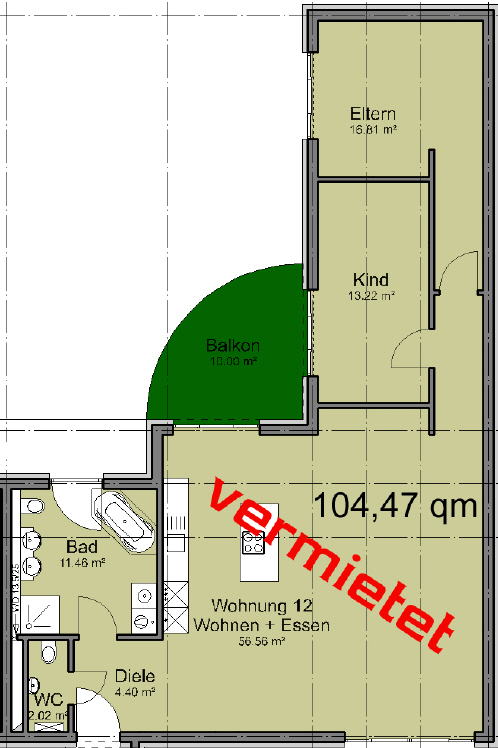 Wohnung 12ca. 104.47 qmBalkon ca. 10.00 qm950,- € Kaltmiete incl. Stellplatz im Erdgeschoss